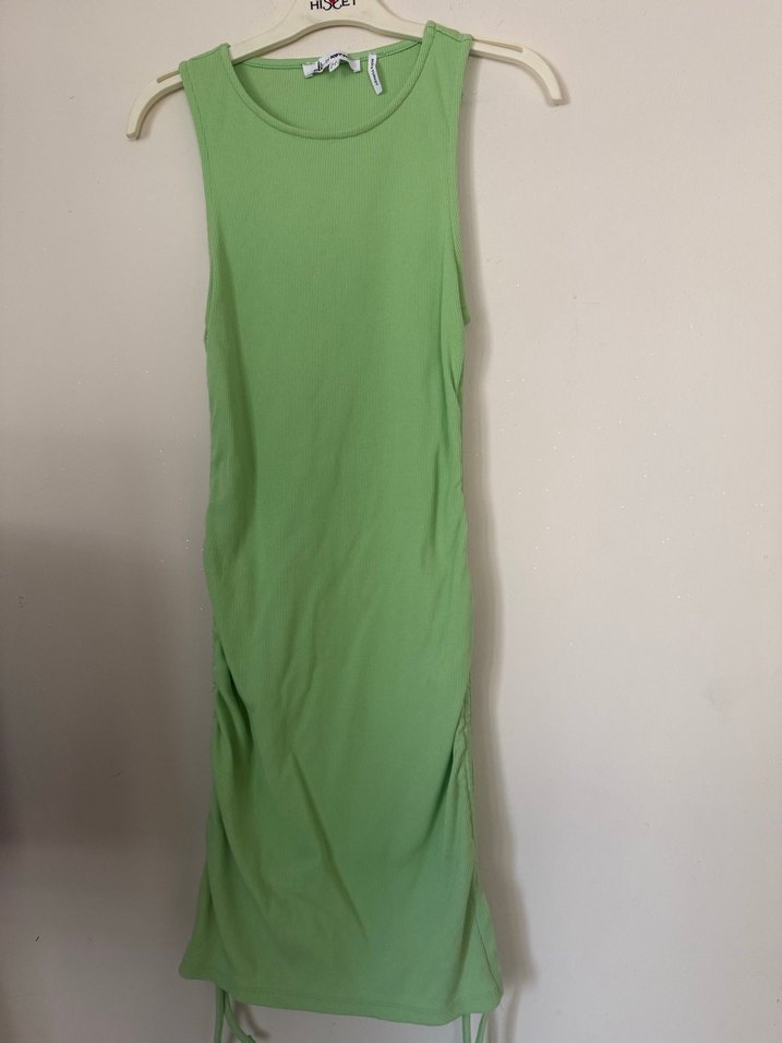 Yeşil koton yazlık elbise L beden defosuz yanlardan büzgülü