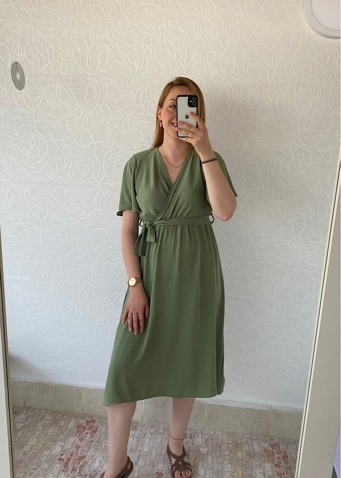 Kruvaze yaka belden bağlamalı elbise S beden