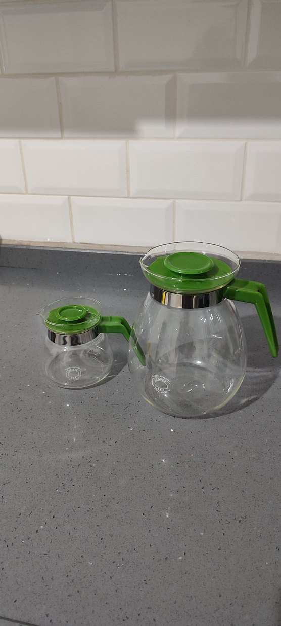 İki farklı boyda, yeşil kulplu ve kapaklı cam çaydanlık seti. Modern tasarımlı, şeffaf gövde ve yeşil detaylar içerir.