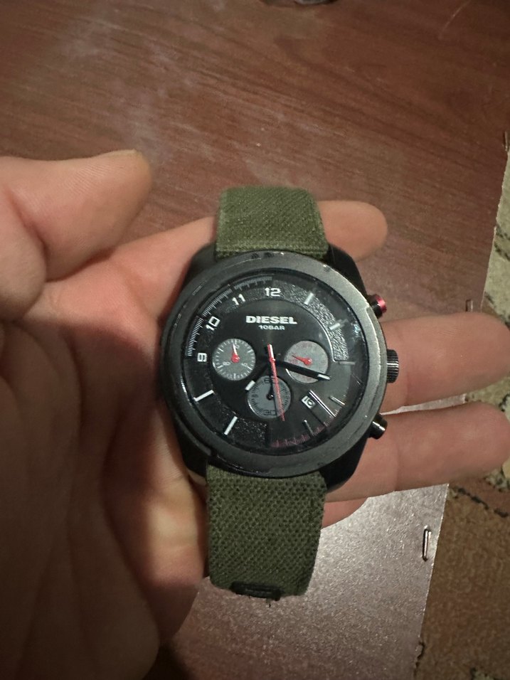 Diesel erkek kol saati, koyu yeşil kumaş kayış ve kronograf özellikli siyah kadran ile sokak stilini yansıtıyor.⌚