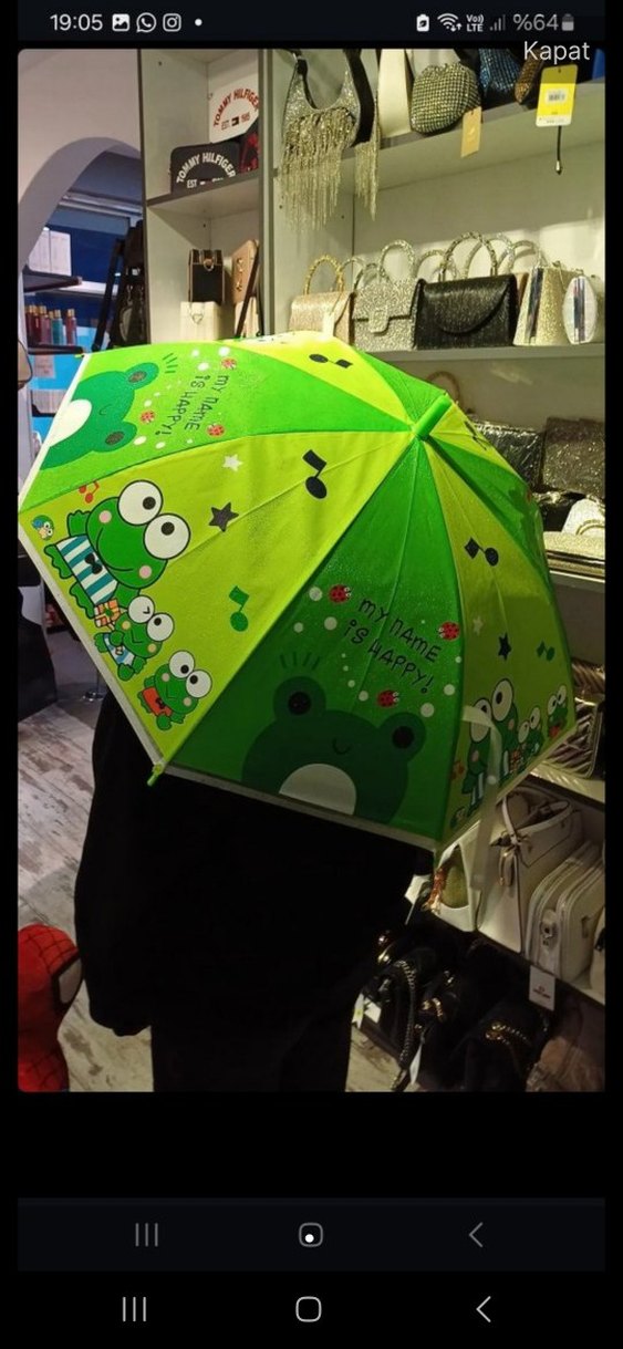 Renkli yeşil şemsiye, kabarık panellerde eğlenceli kurbağa ve müzik notalarıyla pop kültür ve sokak stili havası katıyor.