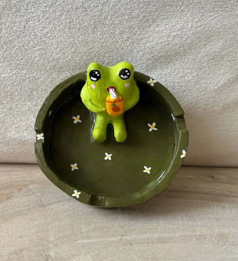 Renkli yeşil kurbağa figürü, küçük beyaz çiçeklerle süslenmiş yuvarlak dekoratif tabakta oturuyor, elinde küçük turuncu bir fincan var.
