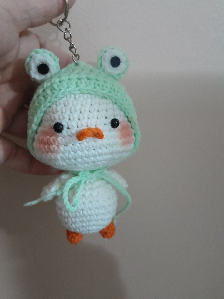 Renkli ve yumuşak amigurumi anahtarlık, beyaz karakterin yeşil kurbağa şapkasına sahip detaylı tasarımıyla öne çıkar.