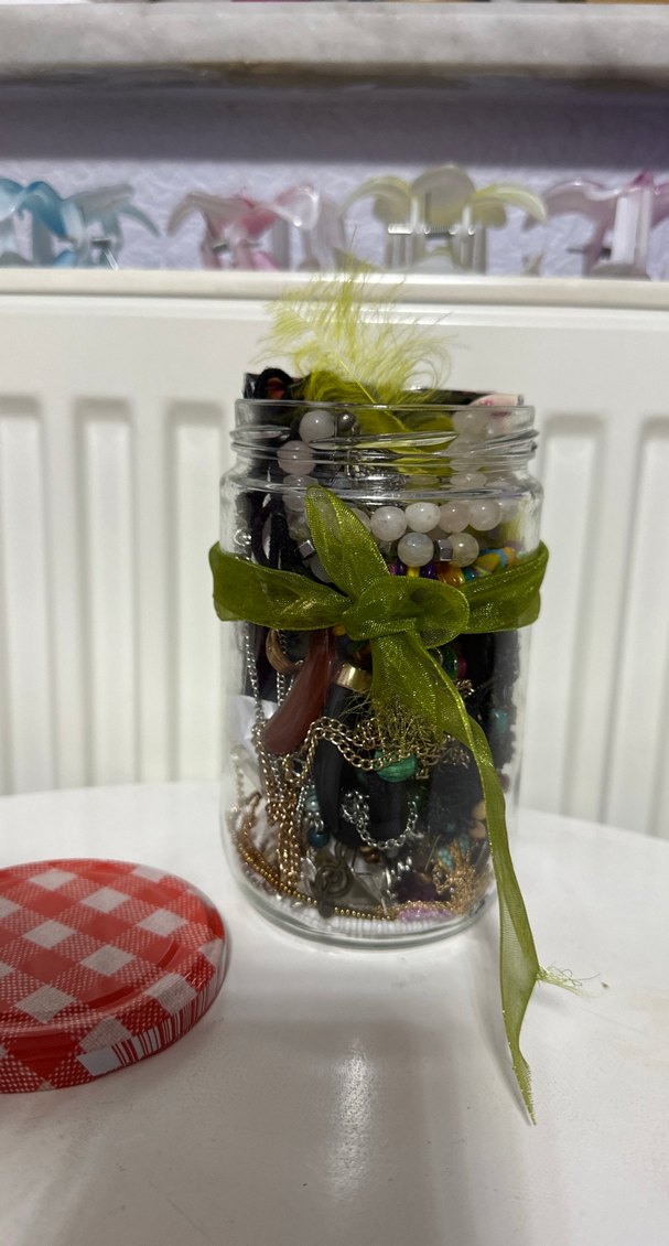 sürpriz takı kavanozu içinde yok yok.. zevkli ürünler koydum umarım beğenirsiniz pişman olmayacağına eminim her tarzda takı mevcut choker yüzük taşlı yüzük bileklik halhal çelik takılar küpe tırnak süsü stickeri earcuff çelik uzun kolyeler (4-5adet) içerisinde en az 400₺lik doğal taşlı bilezik/bileklik ve kolye bulunmaktadır alana hayırlı olsun yanında 1 adette lotus toka hediyedir doğal taşların ve uzun kolyelerin olmadığı halide sayfamda 200₺ye satışta