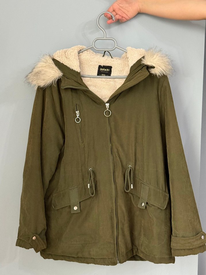 Kadın mont, bol kesim, uzun kollu ve notch yaka detaylıdır. Yumuşak ve sıcak yeşil renkli kumaş, kapüşonda gri kürk detayına sahiptir. Normal boyda, ön ceplidir.