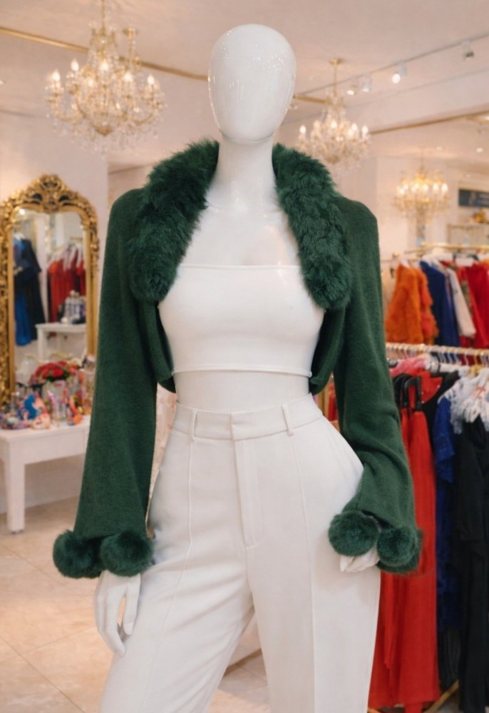 Yeşil, kürklü detaylı, straplez yaka ve uzun kollu, nakışlı midi boy, fleece kumaştan klasik ve şık kadın ceketi.Zarif pofuduk detaylarıyla öne çıkan bu yeşil bolero, lüks ve modern stilin kusursuz birleşimini sunar. Kollarındaki ikili pofuduk tasarım ürüne sofistike bir hava katarken, kısa kesimi sayesinde siyah ya da beyaz straplez bluzlarla mükemmel uyum sağlar. Şık ve feminen duruşu ile hem özel davetlerde hem de stil sahibi kombinlerde fark yaratır. Öne Çıkan Özellikler Pofuduk detaylı özel tasarım Kısa bolero formu Siyah & beyaz straplez ile uyumlu Lüks mağaza stili Şık, modern ve iddialı görünüm Günlük şıklığınızı bir üst seviyeye taşımak ve dikkat çekici kombinler oluşturmak için ideal bir parça. ✨