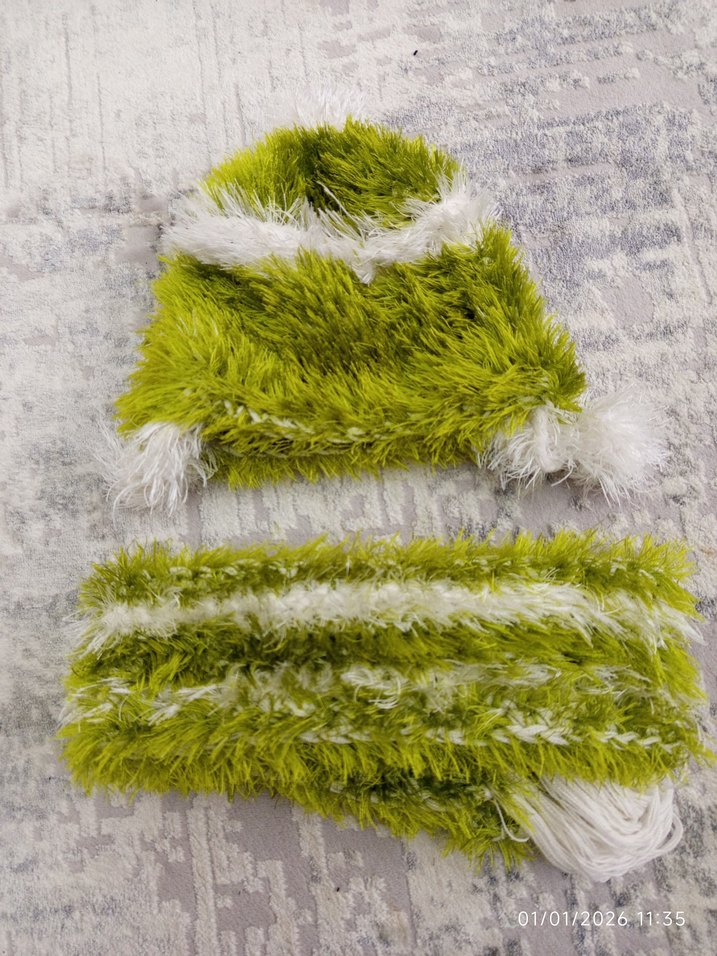 Renkli örgü çocuk bere ve atkı seti, yeşil batik desenler ve kürk detaylarıyla trend ve avangart bir görünüm sunar. el işi