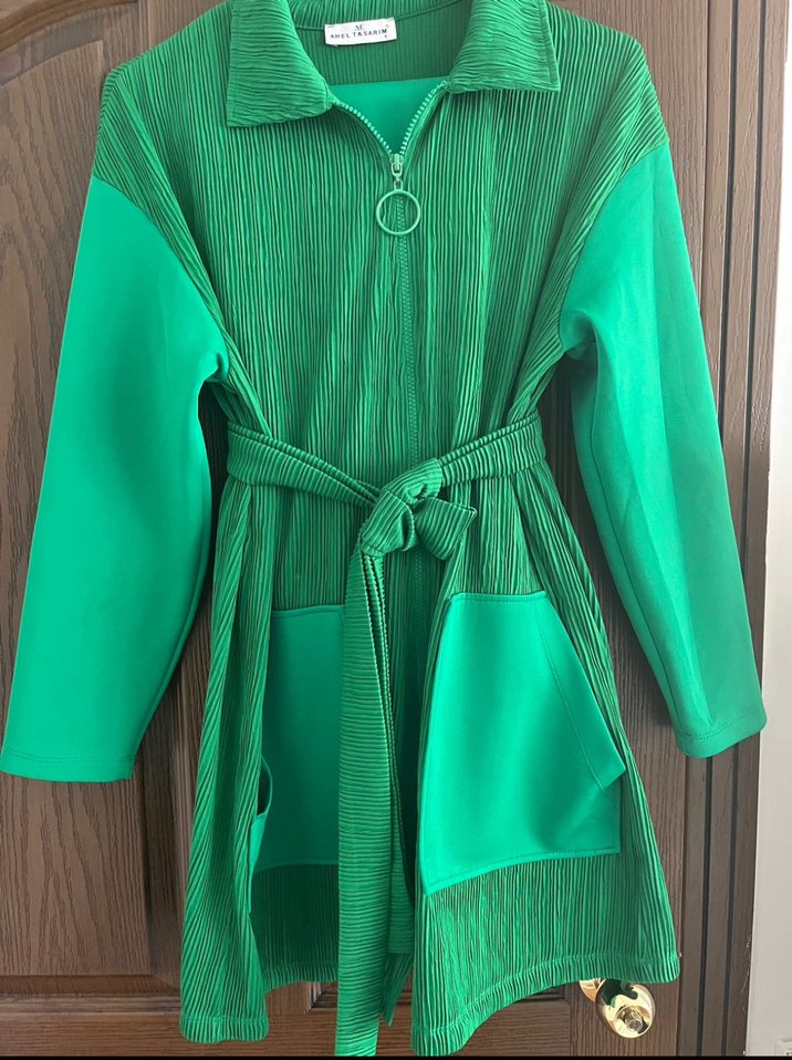 Uzun yeşil hamile ceketi, kuşaklı bel ve uzun kollu, yumuşak sentetik kumaştan. Notlu yaka ve bol kesimle sokak modasına uygun. ✨