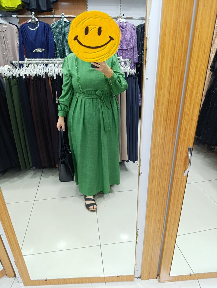 Yeşil renkli, kuşaklı ve bol kesimli uzun elbise, yumuşak keten kumaştan üretilmiştir. Bisiklet yaka ve ince askılı kollara sahiptir, günlük rahat kullanım için uygundur.