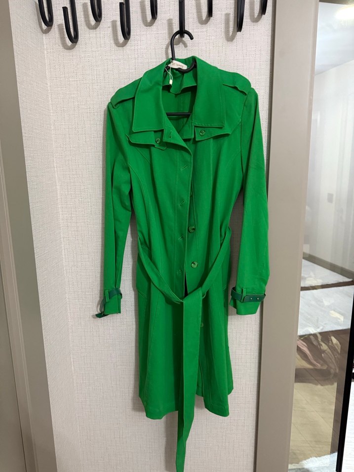 Uzun yeşil trençkot, kuşaklı ve kesimli yaka detaylıdır. Uzun kollu, regular fit ve sentetik kumaştan üretilmiştir, ofis kullanımı için uygundur.