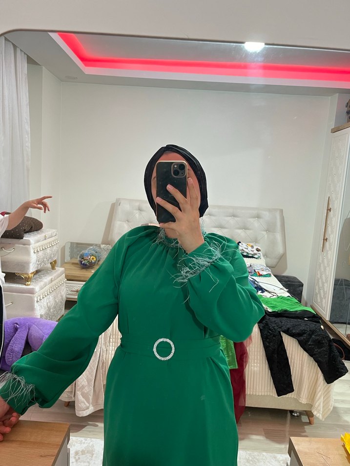 Yeşil Kuşaklı Uzun Kollu Uzun Elbise