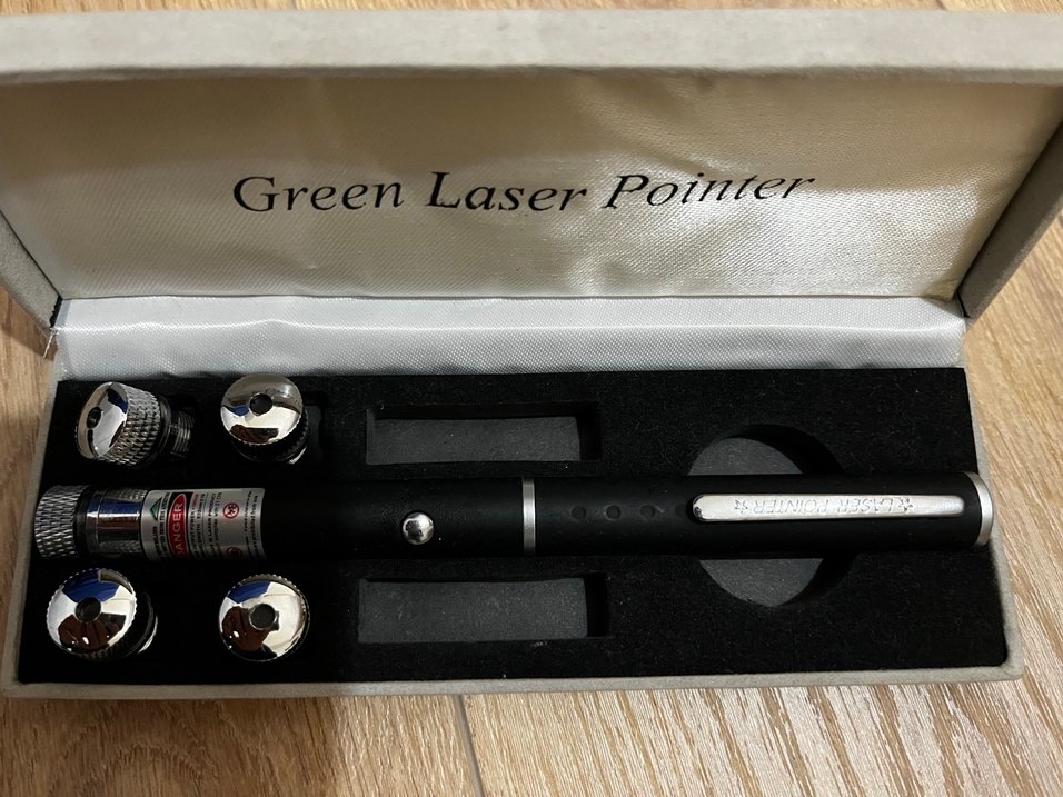 Kutu içinde sunulan, yeşil lazer işaretleyici ( pointer ) , sıfır , kullanılmamış ürün.