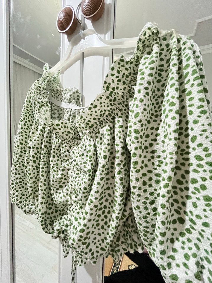 Bu açık yeşil bluz, keten kumaştan yapılmış, bol kesim ve drapeli uzun kollu, askısız yakalıdır. Mini boyda ve leopar desenlidir, bohem tarzına uygundur.