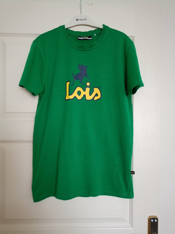 Yeşil renkli, kısa kollu erkek tişörtü, yuvarlak yaka ve renkli Lois baskısına sahiptir. Rahat kesim ve normal boydadır. Yumuşak, sıcak kumaştan üretilmiş, Velcro detayı bulunur.
