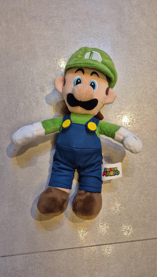 Super Mario'dan Luigi peluş oyuncak, yeşil şapka, mavi tulum ve beyaz eldivenlerden. Temiz ve sorunsuz, orijinal üründür.