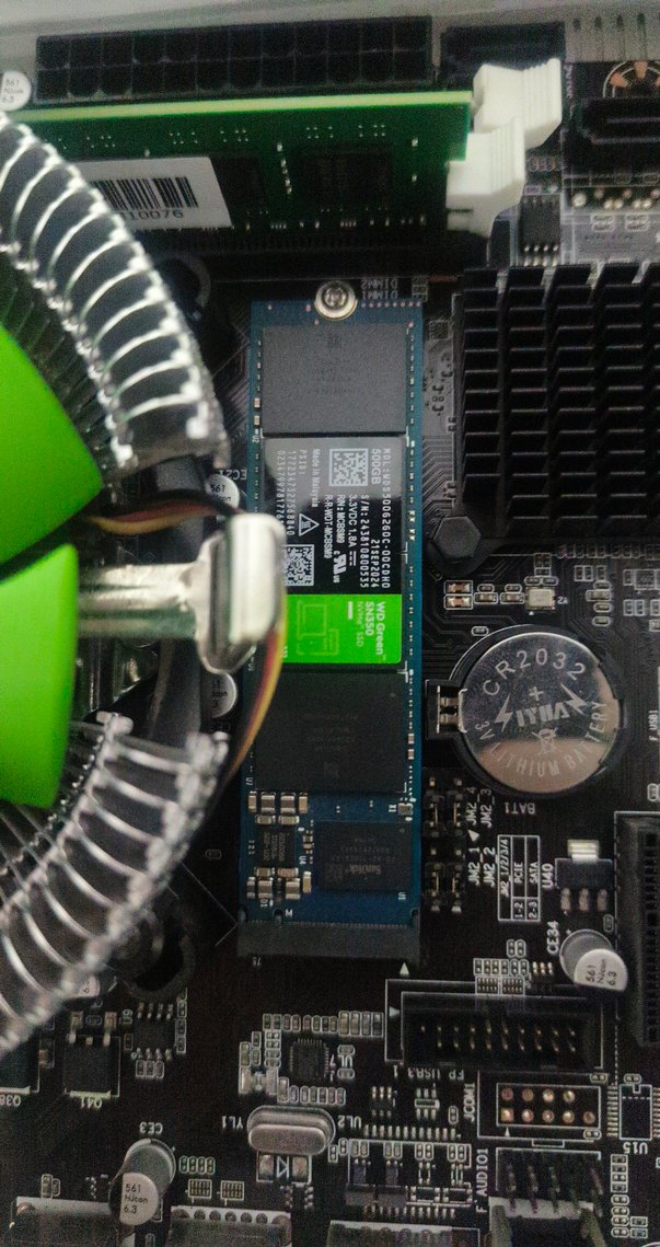 Yeşil renkli M.2 SSD, anakarta takılı ve yakınında soğutucu fan ile CR2032 pil yer alıyor. WD GREENN 500 GB M2 SSD SAGLİK 99