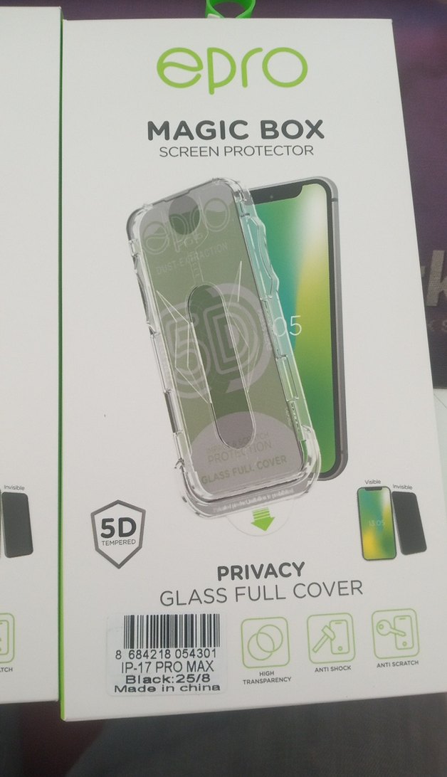 Magic Box ekran koruyucu, iPhone 17 Pro Max için tam cam kaplama ve gizlilik özelliği sunar. Açık yeşil renkte olup yüksek şeffaflık, darbe ve çizilme koruması sağlar. ️