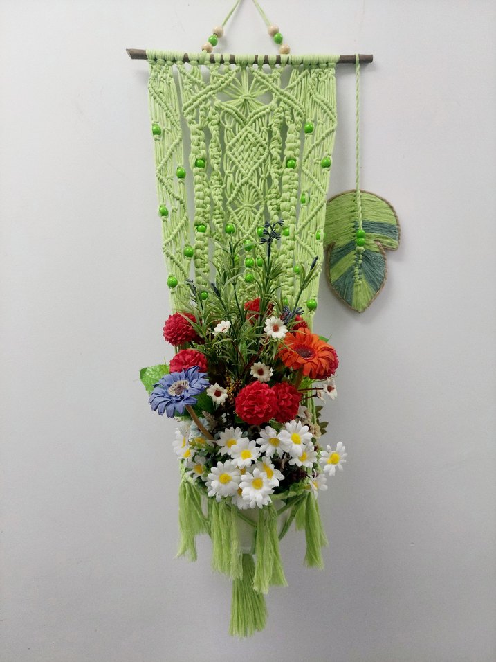 Yeşil makrome duvar süsü, renkli yapay çiçekler ve ahşap boncuklarla süslenmiş, detaylı düğüm desenlerine sahip.