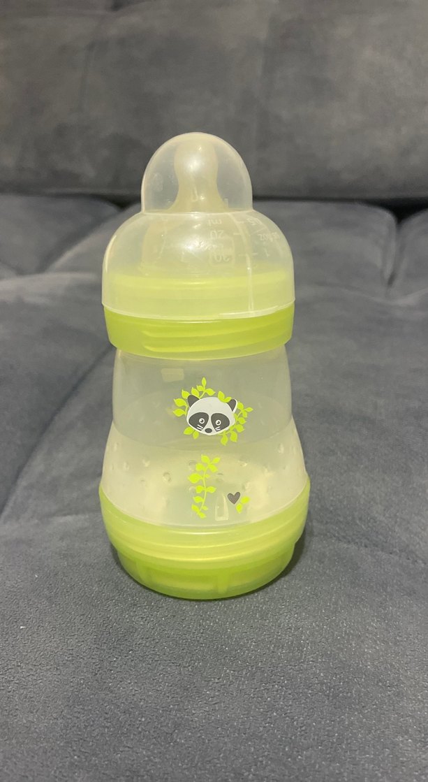 Yeşil renkli, sevimli panda desenli bebek biberonu. Yumuşak ve şeffaf emzikli, kolay tutulabilen tasarıma sahiptir. Alttan açılır o nedenle temizlemesi kolay,kısa süre sadece su içmek için oğlum kullandı.