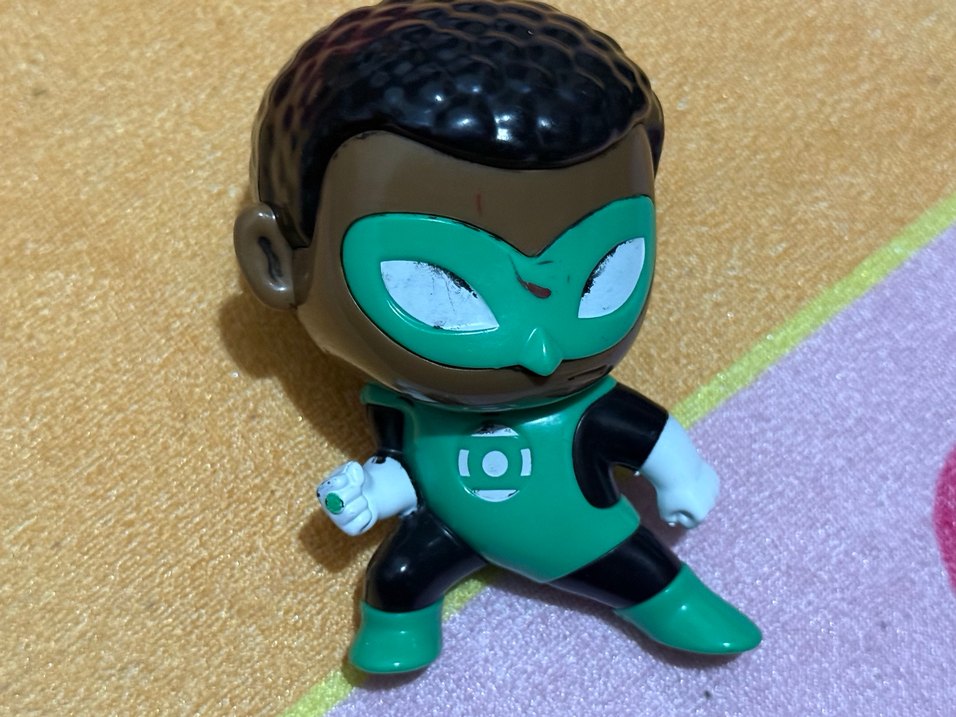 Koyu tonlarda, yeşil maskeli ve kıyafetli aksiyon figürü. Beyaz eldiven ve çizme detayları bulunur, elinde küçük bir aksesuar vardır.
