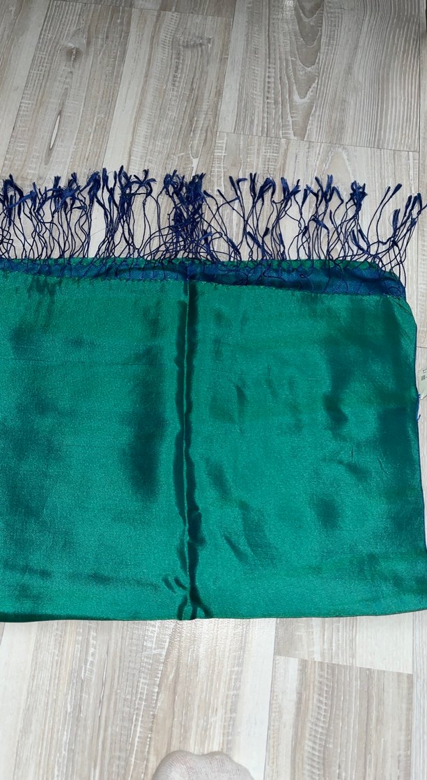Kadınlar için parlak yeşil mavi renkli, ipek görünümlü ve drapeli tasarımlı şal. Püsküllü kenarlarıyla bohem tarzını yansıtıyor.