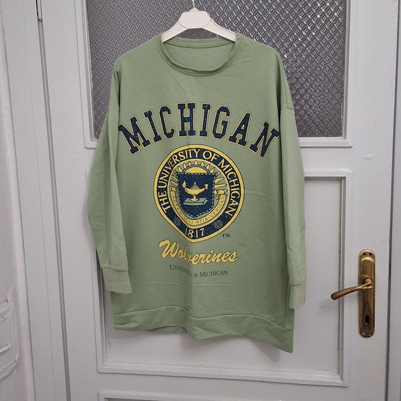 Yeşil renkte, baskılı Michigan üniversitesi desenli, uzun kollu, yuvarlak yaka ve bol kesim kadın sweatshirtü. Yumuşak ve sıcak kumaştan üretilmiştir.