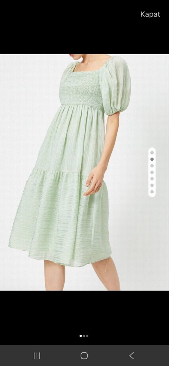 Yeşil renkte, pileli detaylara ve kayık yaka tasarıma sahip midi boy, bol kesim elbise. Kısa balon kollu, yumuşak sentetik kumaştan üretilmiştir. Romantik akşamlar için uygun.
