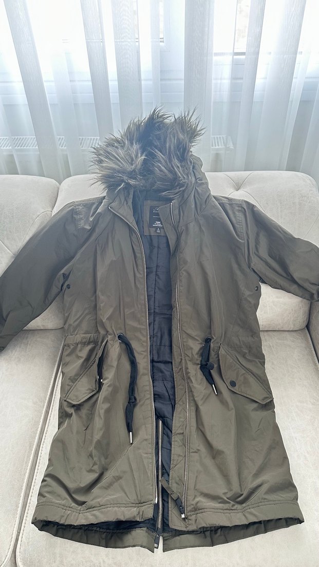 Yeşil renkte, kürklü kapüşonlu ve uzun kollu, midi boyda, sokak stiline uygun, yumuşak sentetik kumaştan yapılmış dar kesim mont. Günlük kullanıma uygundur.