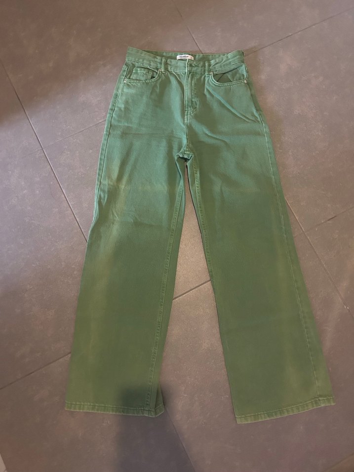 Yeşil renkte, midi boy ve regular fit kesime sahip denim kadın jean. Günlük kullanım için rahat ve şık bir sokak stili sunar.