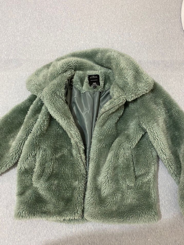 Yeşil renkte, yakalı ve uzun kollu suni kürk ceket. Midi boyda, bol kesim ve yumuşak astarlı, rahat ve sıcak tutar. Günlük sokak stili için uygundur.