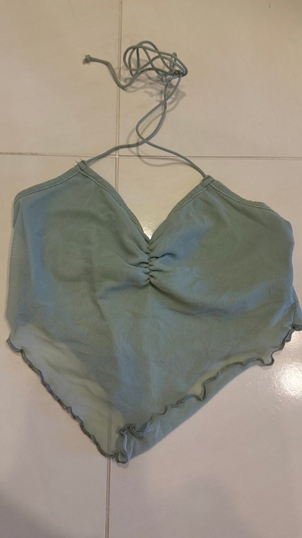 Yeşil midi uzunluğunda, ön kısmı büzgülü, ince askılı ve rahat sokak stili bralet. Pastel tonuyla yumuşak bir görünüm sunar.