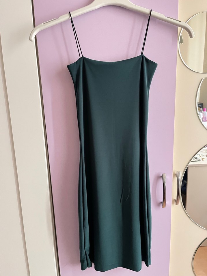 İnce askılı, drapeli ve yeşil midi elbise, sade ve şık görünümü ile romantik akşamlar için uygundur. Straplez yaka ve dar kesimlidir.