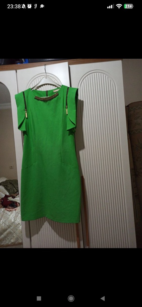 Kolsuz, yeşil midi elbise, drapeli detaylar ve yuvarlak yaka ile. Parlak yüzeyli, sentetik kumaştan, Vücuda oturan. Şık abiye.