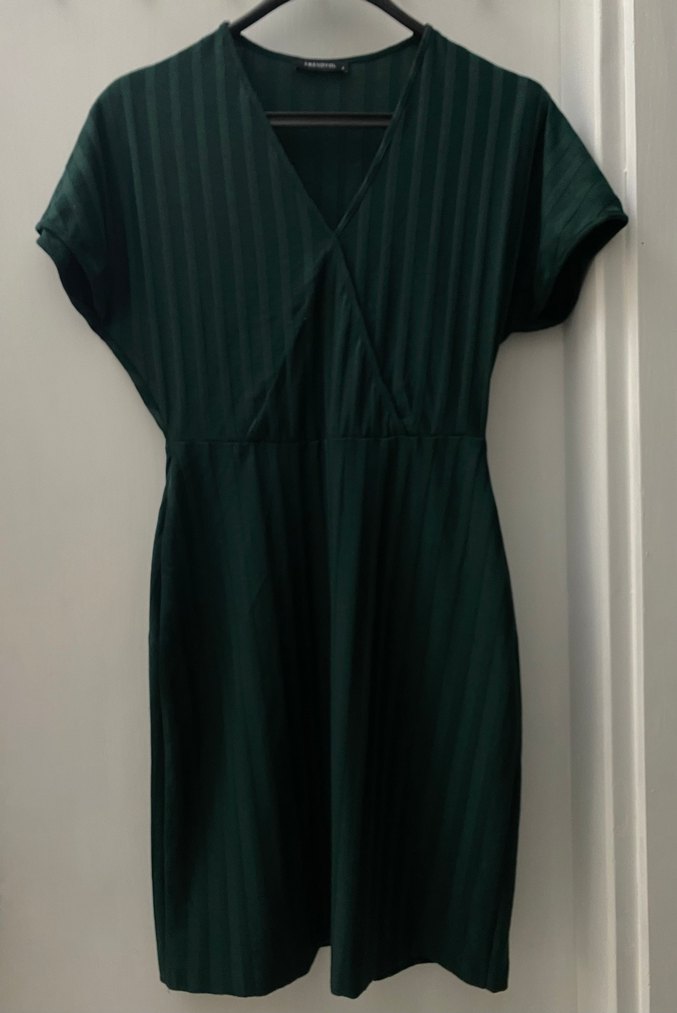 V yaka ve kısa kollu, vücuda oturan midi elbise. Pileli detaylı ve yumuşak sentetik kumaştan, ofis için uygun yeşil renk.