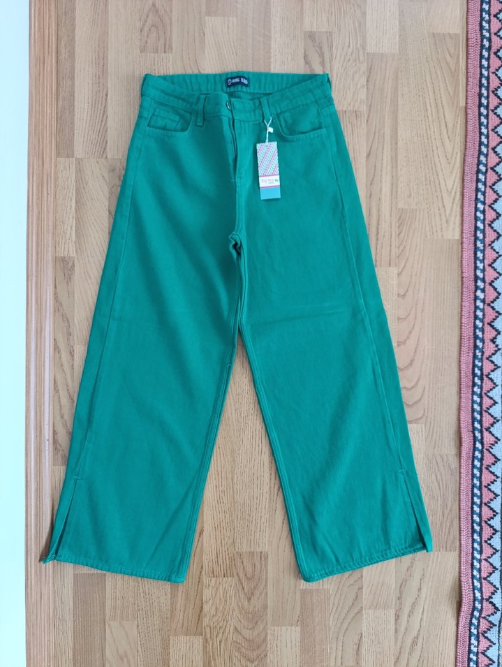 Pamuklu, pastel yeşil renkte, midi uzunlukta ve geniş kesim kot pantolon. Rahat ve şık görünümüyle günlük kullanıma uygun.