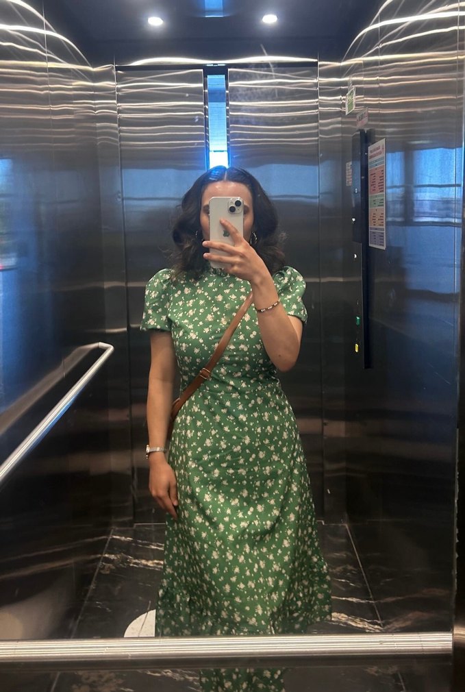 Yeşil midi elbise, yüksek yakalı ve kısa kollu, sentetik kumaştan, günlük bohem tarzda rahat bir modeldir. Hiç bir defosu yoktur nerdeyse yeni gibi