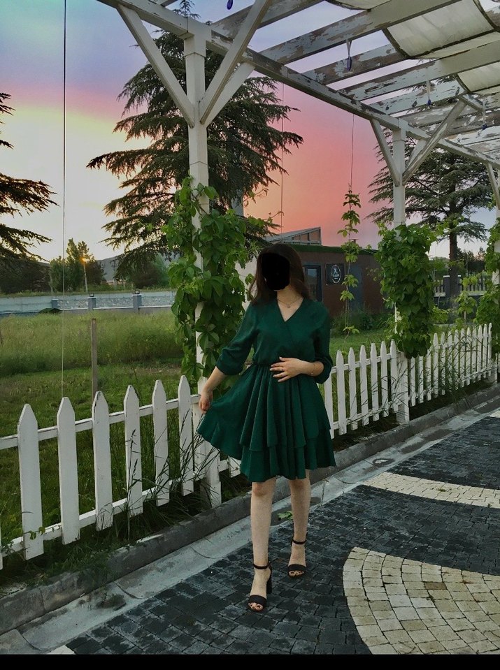 Koyu yeşil midi elbise bol kesim ve drapeli tasarıma sahip. V yaka ve uzun kollu, günlük rahat kullanıma uygundur. Xs-s-m uyumludur belinde lastik var rahat oluyor.hiçbir deformesi yoktur