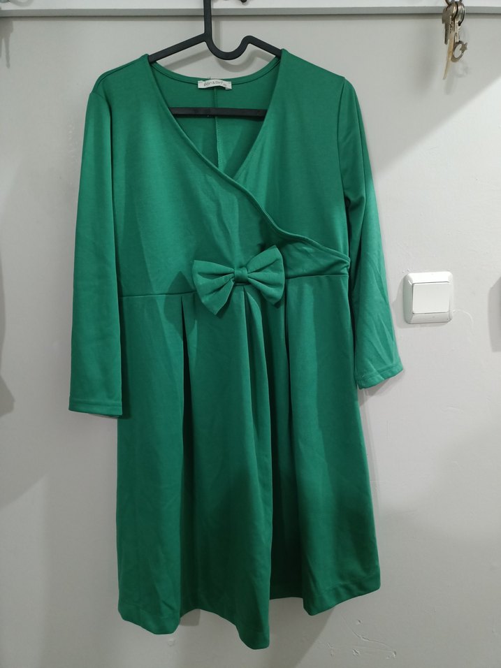 Yeşil midi hamile elbisesi, V yaka ve uzun kollu, belde fiyonk detayıyla bol kesim. Minimalist, desensiz ve ofis için uygun.
