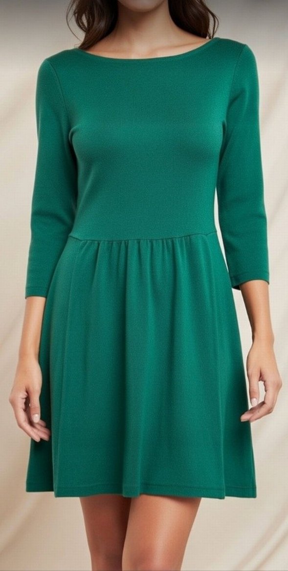 Yeşil midi elbise, yuvarlak yaka ve uzun kollu, düzgün sentetik kumaştan. Bol kesim ve parlak yüzeyle minimalist, çağdaş ofis tarzı