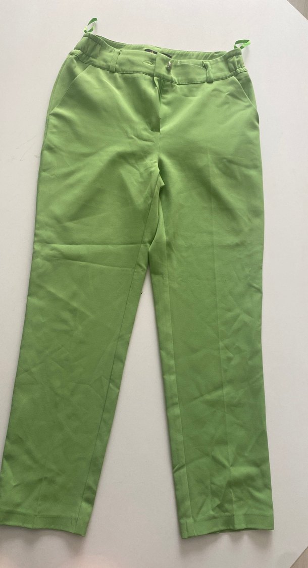 Yeşil renkli, midi boy, regular fit kadın kumaş pantolon. Parlak sentetik kumaştan, minimalist ofis stiline uygun.