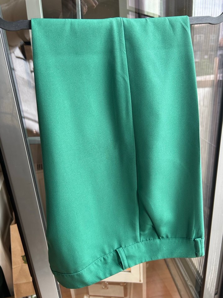 Yeşil kumaştan, drapeli ve normal kesim midi uzunluğunda kadın pantolon. Parlak dokusuyla iş ve ofis stiline uygundur.