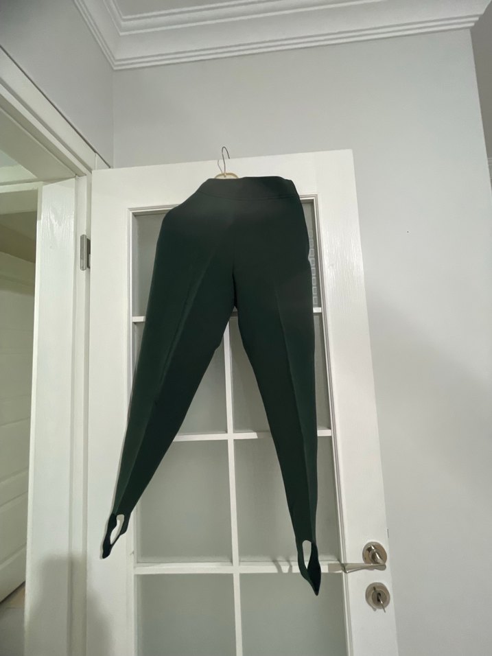 Yeşil renkli, midi boy, kumaş kadın pantolon. Düz kesim, yırtmaç detaylı, ofis için uygun, minimalist normcore tarzında. Ayaktan geçmeli pantolon şık