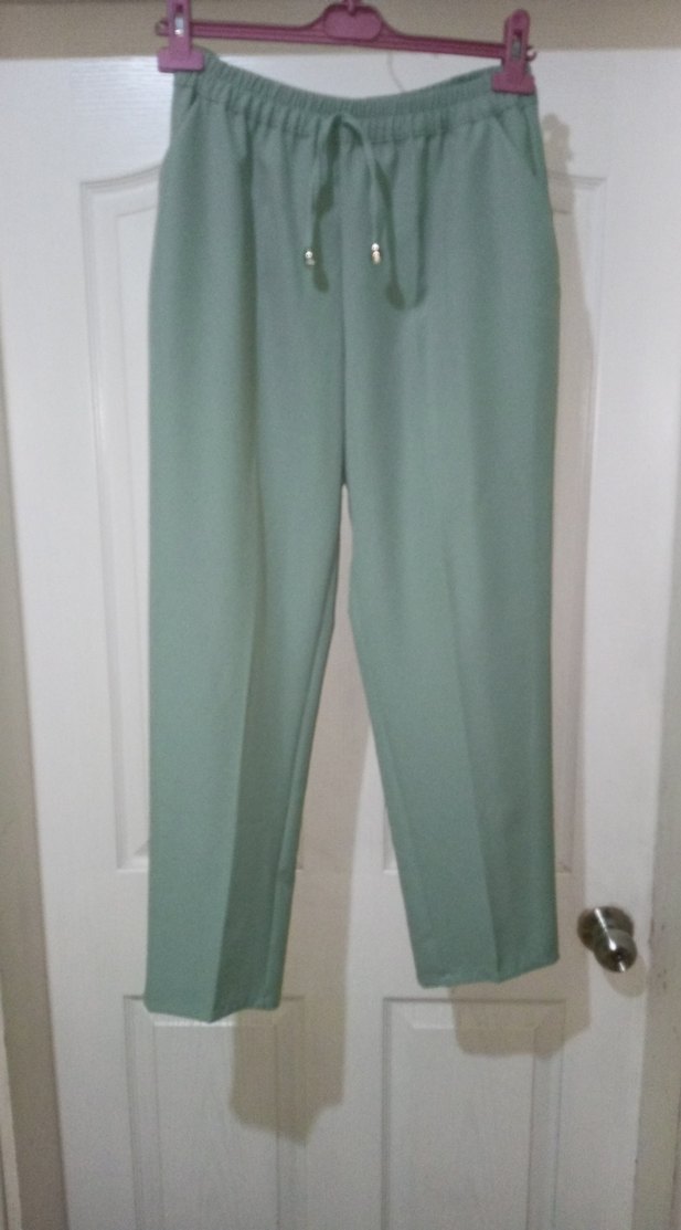 Pastel yeşil midi uzunlukta, regular fit kadın kumaş pantolon. Ofis için uygun, kolay şıklık sunan minimalist tarzda, sentetik kumaştan. hiç kullanılmamıştır sıfırdır.
