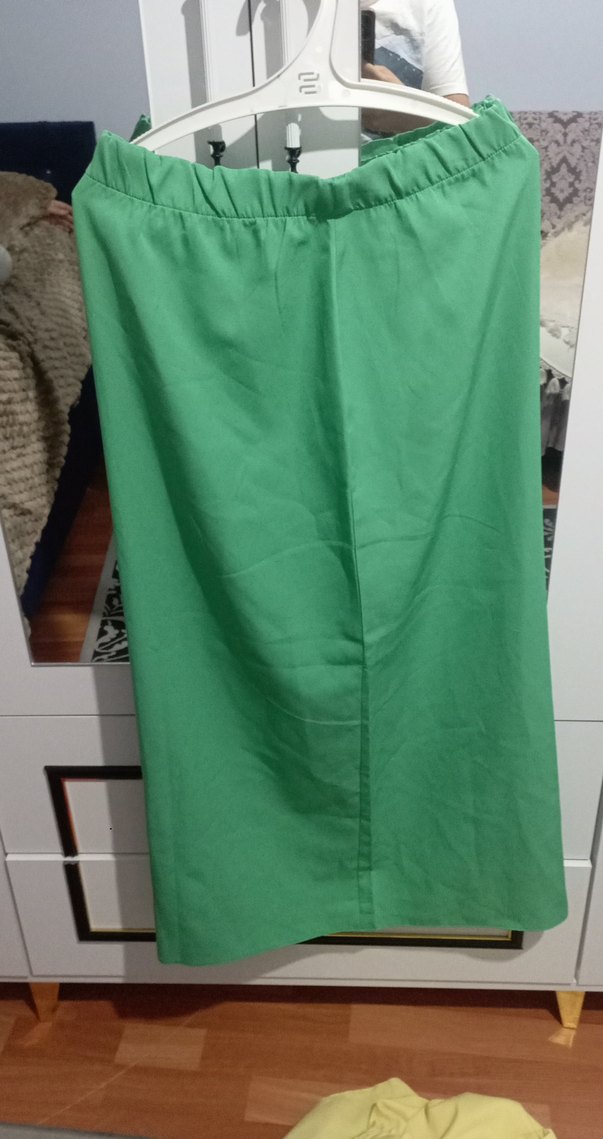 Sentetik kumaştan, normal boyda ve regular fit yeşil kadın pantolonu, drapeli ve parlak dokulu. Günlük kullanıma uygun.