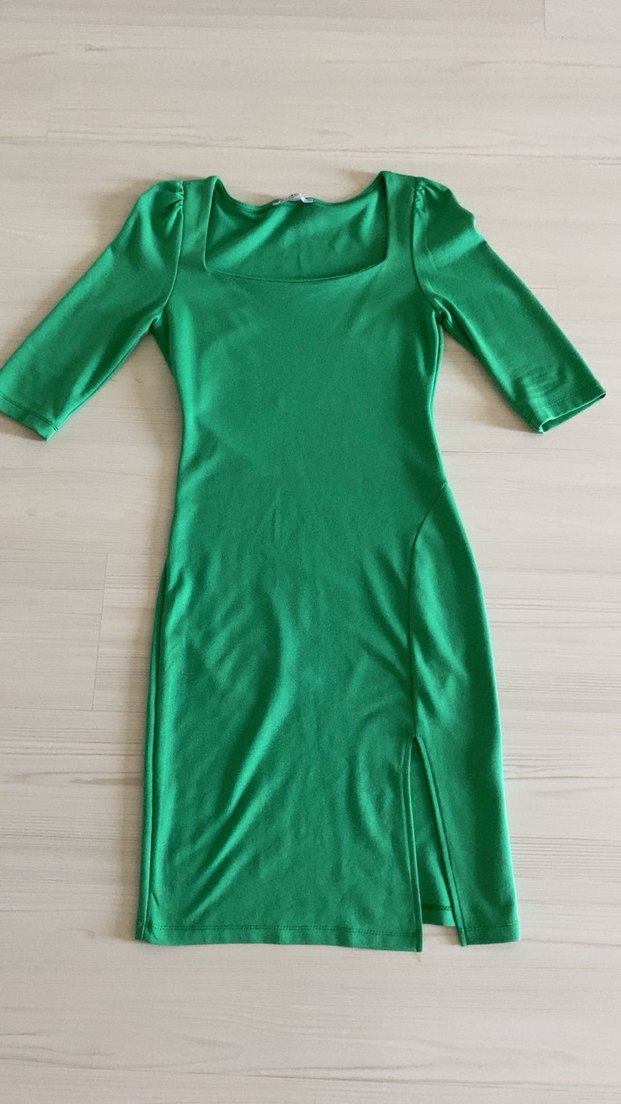 Yeşil, kalem kesim midi elbise, kare yaka ve üç çeyrek kolludur. Düz, sentetik kumaştan yapılmış, minimal ve renkli sokak stili sunar, küçük yırtmaç içerir.