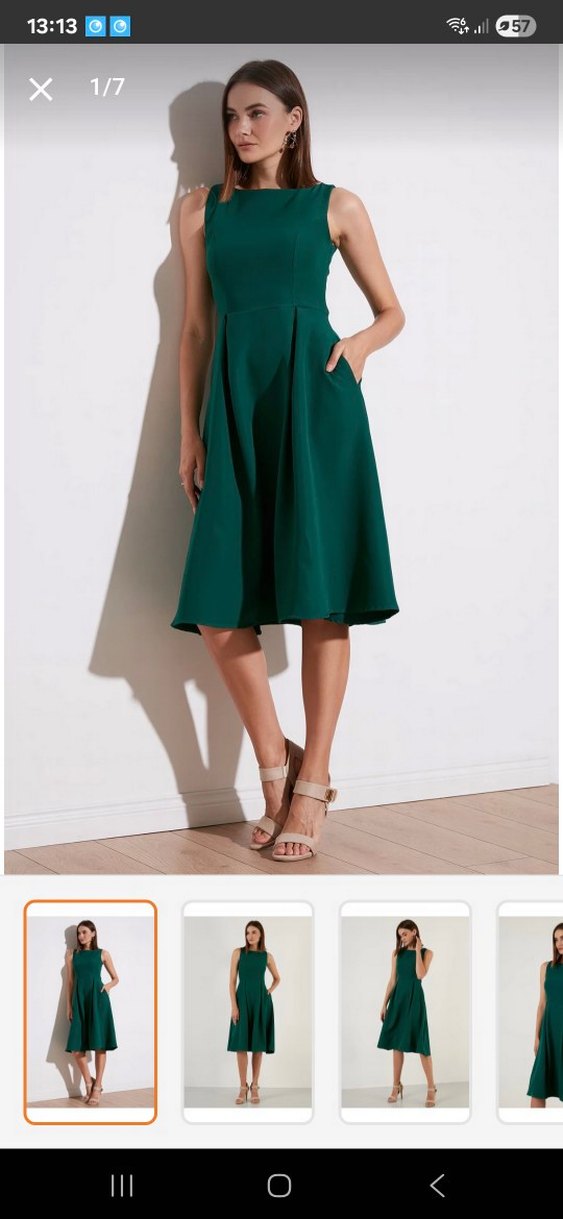 Yeşil midi elbise, tek renk ve kolsuz, Kayık yaka ve rahat kesimiyle ofis için şık bir tercihtir.