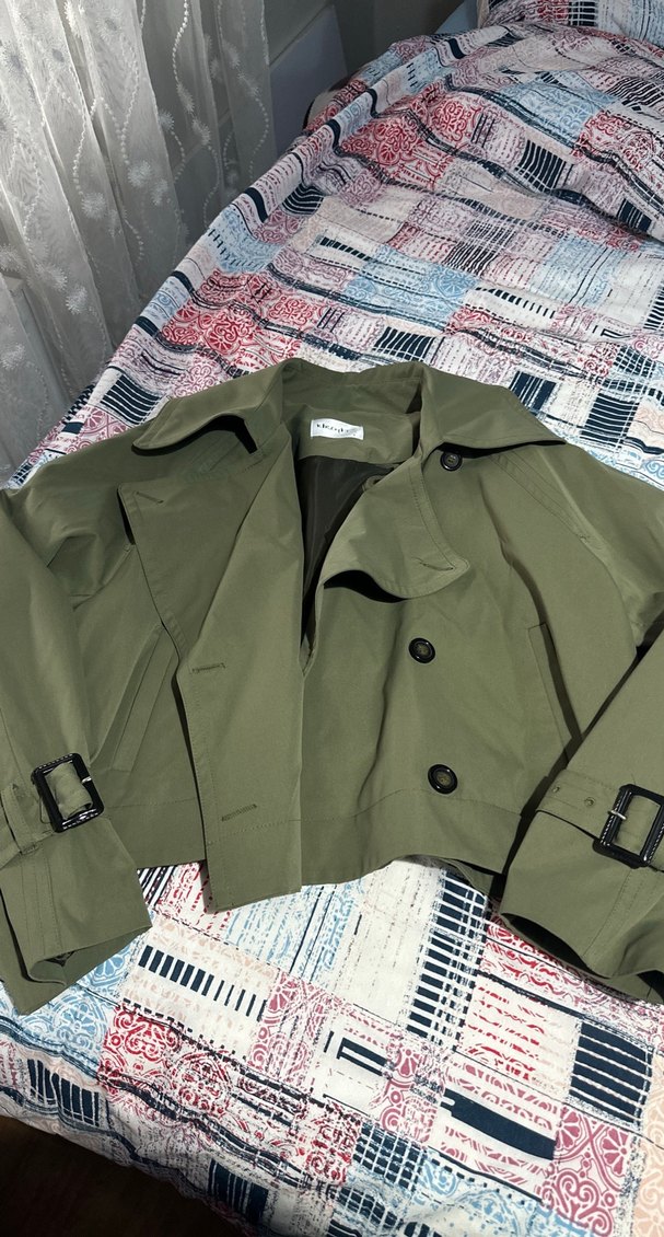 Yeşil midi uzunlukta, kemerli ve notched lapel yakalı kadın trençkot. Sentetik kumaştan, bol kesim ve askılı kollu, günlük sokak stiline uygun.