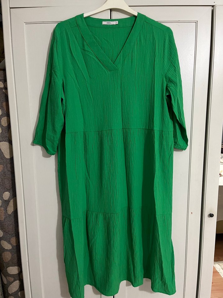 Yeşil renkli, keten kumaştan yapılmış, V yaka ve pile detaylı midi uzunlukta bol kesim elbise. Minimalist bohem tarzına uygundur.
