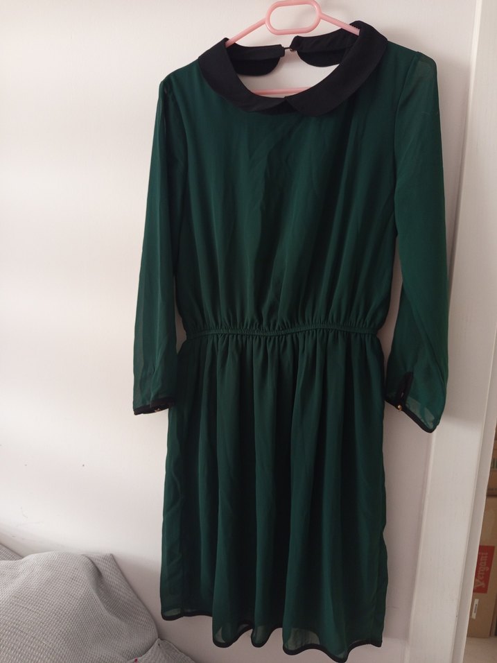 Yeşil midi boy, yakalı ve uzun kollu kadın elbisesi. Belden lastikli, bol kesim, yumuşak sentetik kumaştan, ofis için uygun. şifon elbise