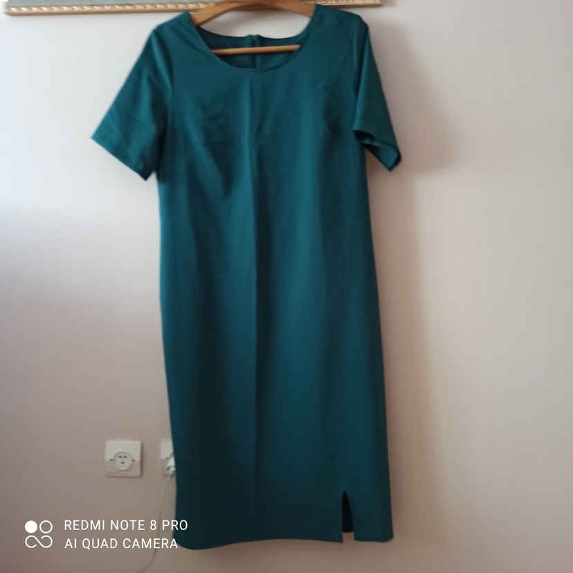 yeşil renkli, kısa kollu, yuvarlak yakalı midi elbise. Düz ve sade tasarımlı, rahat krep hafif streçli kumaştan üretilmiştir. Alt kısmında küçük yırtmaç bulunur.zara değildir . uzunluk 120 cm iki kol arası 55 cm dir